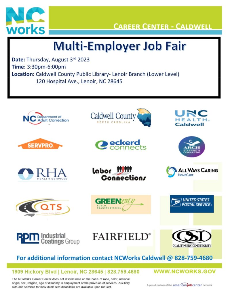 Looking for a job, or maybe a better job? NCWorks is hosting a Multi-Employer Job Fair on Thursday, Aug. 3 from 3:30 p.m. to 6 p.m. in the lower level of the Caldwell County Public Library’s Lenoir Branch. For additional info contact NCWorks Caldwell at 828-759-4680.