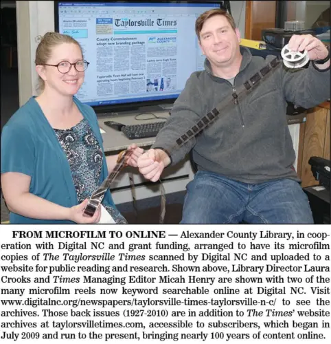“The Alexander County Library has always been honored to offer Taylorsville Times microfilm archives as part of our collection. We are especially grateful to Lee Sharpe for his permission to digitize The Times. Library resources online are an invaluable way to reach out and provide service beyond the doors of the library,” Crooks stated.