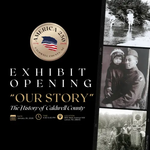 The Caldwell County America 250 Committee will open the “Our Story: The History of Caldwell County” exhibit on Monday, January 26, with a reception beginning at 4:30 p.m. The permanent exhibit is located at the Alden Starnes County Office Plaza, 905 West Avenue, Lenoir.