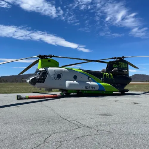 Photo of a twin rotor Chinook helicopter at the Asheville NC airport (an hour after this photo was taken this helicopter was called out to assist with fire suppression on the Jumping Branch Fire)