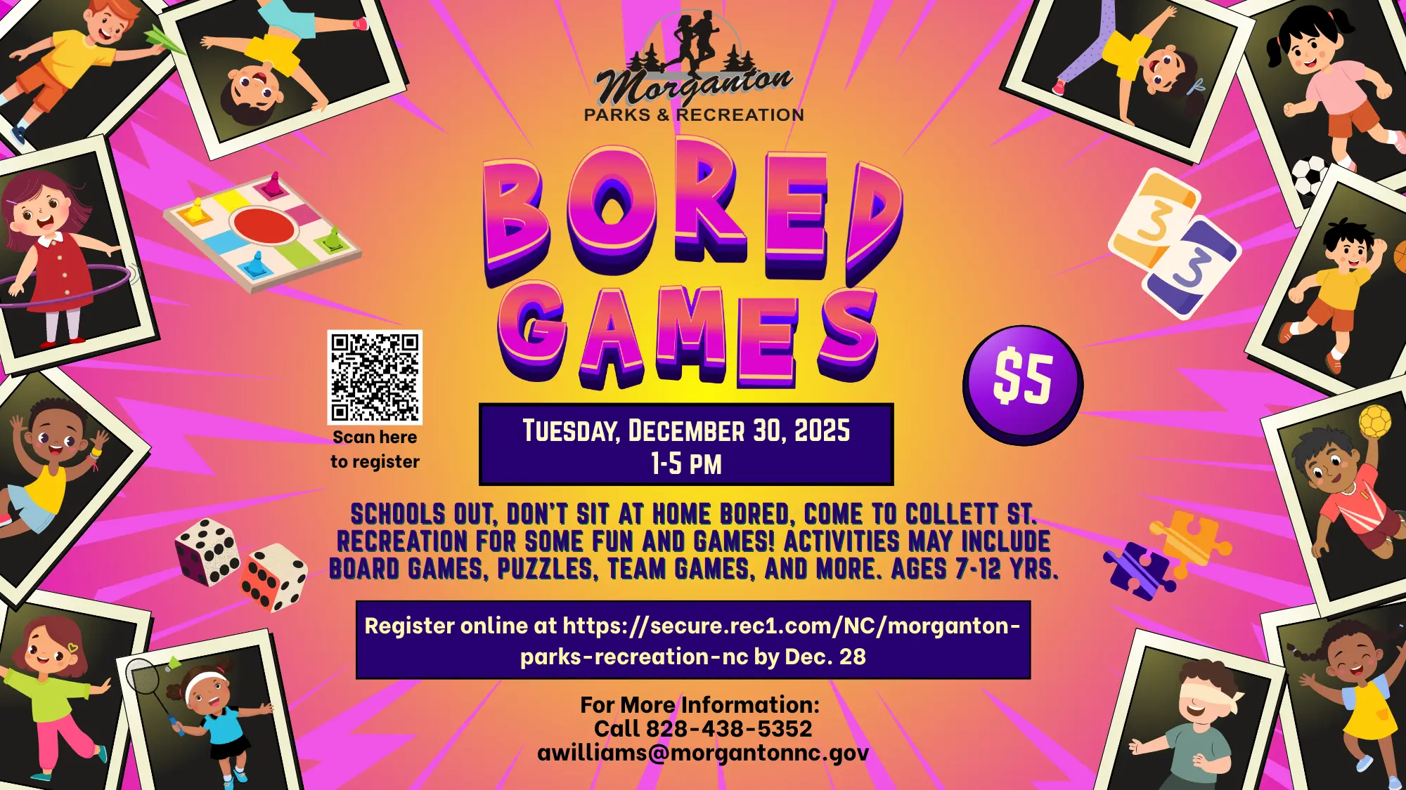 Schools out, don’t sit at home bored, come to Collett St. Recreation for some fun and games! Activities may include board games, puzzles, team games, and more. Register online by the day before the program: Morganton Parks