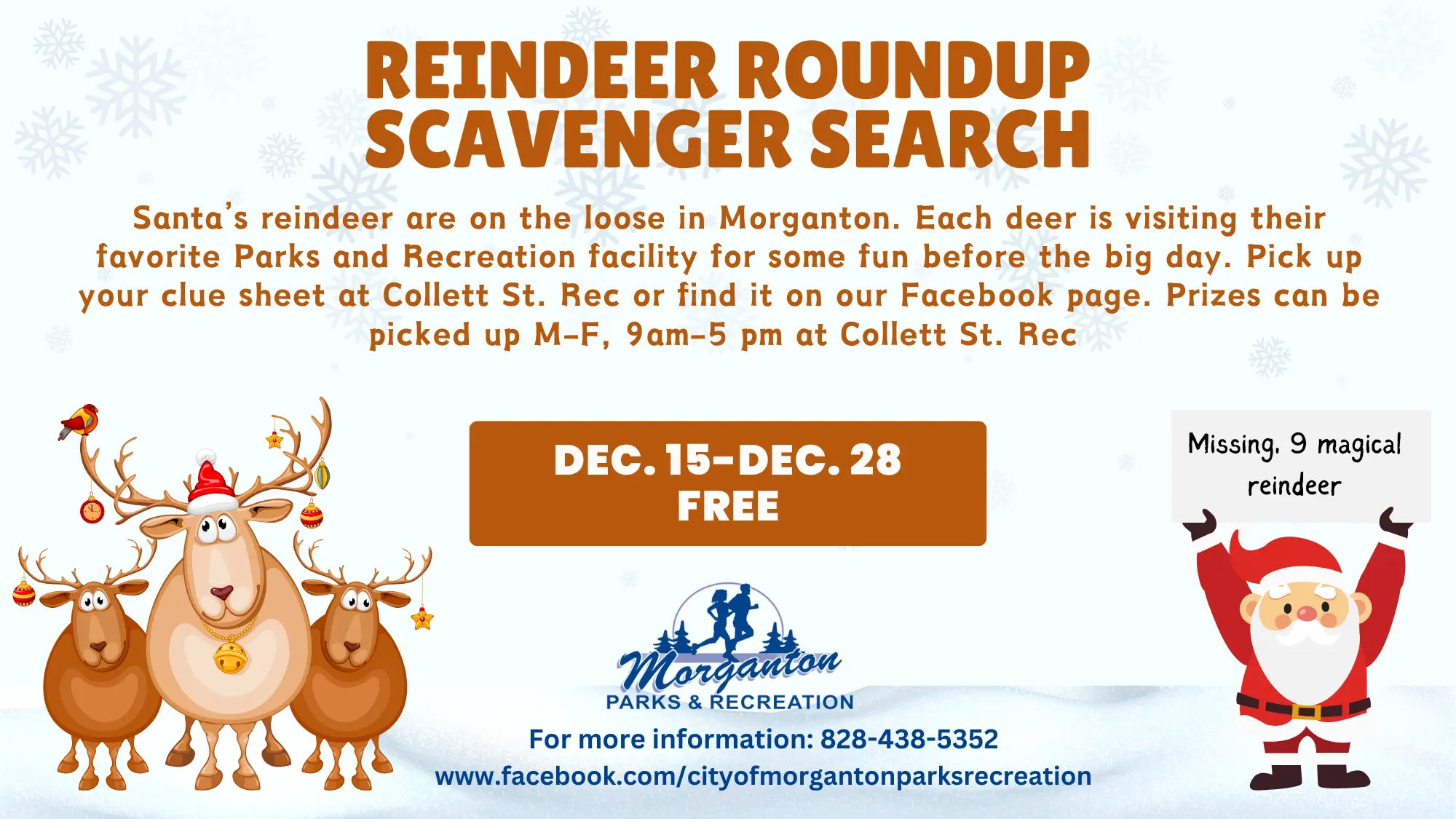 Santa‘s reindeer are on the loose in Morganton. Each deer is visiting their favorite Parks and Recreation facility for some fun before the big day. Pick up your clue sheet at Collett St. Rec or find it