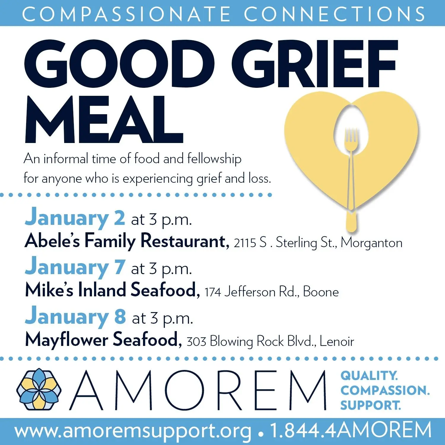 The Good Grief Meal is sponsored through Ashewood Grief and Counseling Services, grief support services of AMOREM, and is one of many opportunities offered to help individuals of all ages and families cope with the loss of